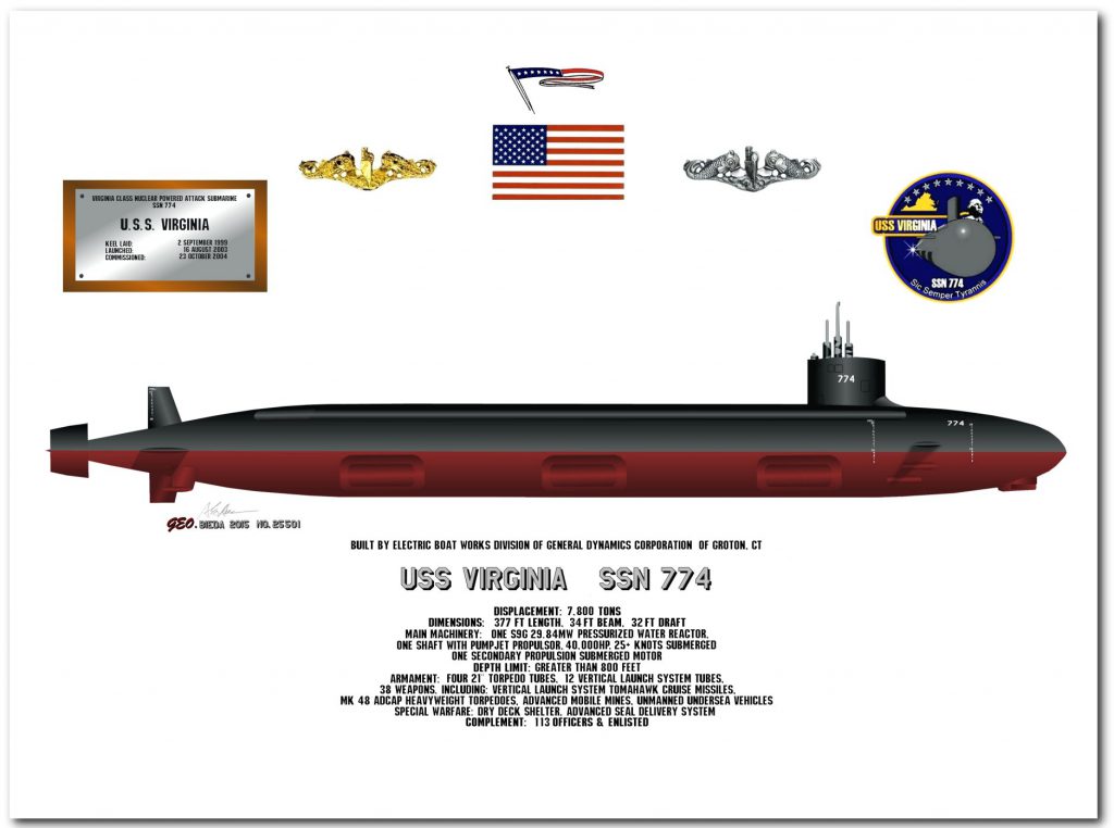 Through our website (www.usmilitaryart.com), we offer profile drawings of all of the Virginia Class submarines. Below is an example of just one of them. If you have an interest in any of these great boats, this link will take you directly to the appropriate page on our site –